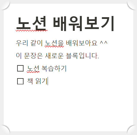 - 글을 한 번 써보세요. 그리고 '엔터'를 치면 다음 블록으로 넘어가게 됩니다.