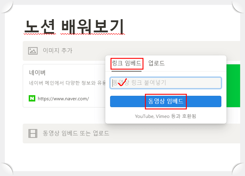 - 동영상도 북마크와 마찬가지로 유튜브처럼 올라와있는 영상들의 링크를 복사 붙여 넣기 해서 가져올 수 있습니다.