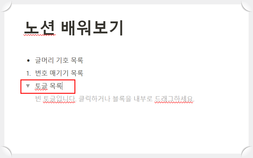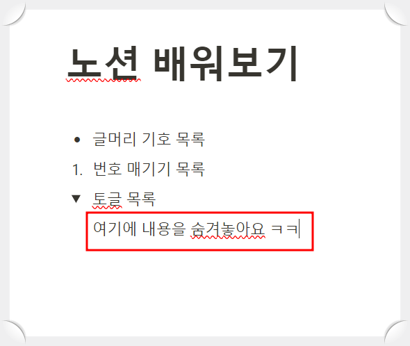 - 토글 기호(역삼각형) 옆에 토글 제목을 쓰고, 아랫줄에 '빈 토글입니다.' 부분을 클릭하여 내용을 써줍니다.